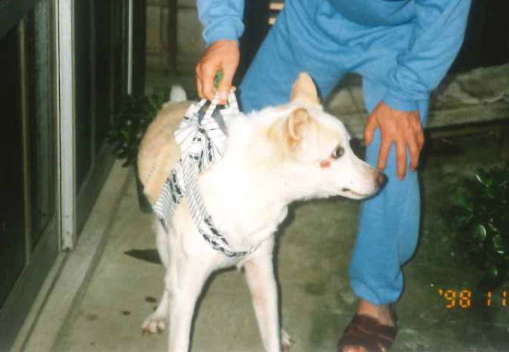 はじまりは、老化で歩くのが難しくなった愛犬のために浴衣の生地を使って手作りした歩行補助具(右写真 / 1998年当時)でした。