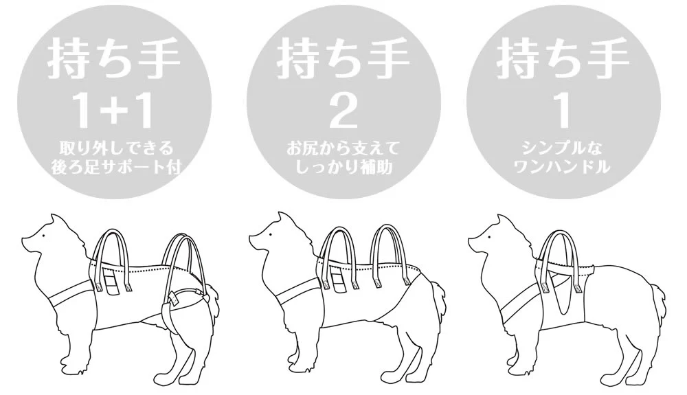 着丈の長い持ち手2タイプは大型犬でも横たわった状態からの姿勢変更や介助の負担も軽減します。